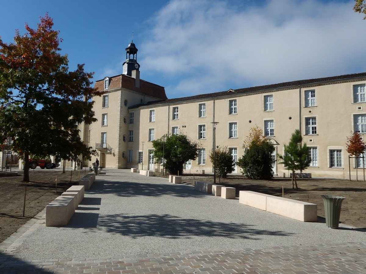 Organisée autour de la diagonale reliant le porche à l’entrée principale du lycée, la première cour structure les perspectives, guide les flux piétons et valorise la façade du bâtiment. Le préau constitue une liaison, une articulation par rapport à la rue. Il représente également une symbolique forte (promenade couverte). Les gradines ne sont pas parallèles entre elles afin de rompre avec la rigidité de la trame urbaine dans laquelle le lycée s’inscrit.